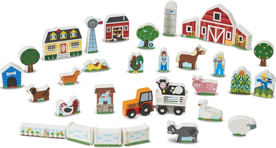 Das Melissa and Doug Farm-Set enthält Holzfiguren wie Bäume, Figuren, Gebäude und Tiere.